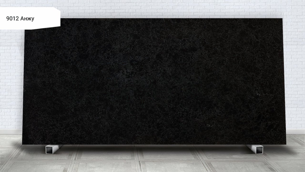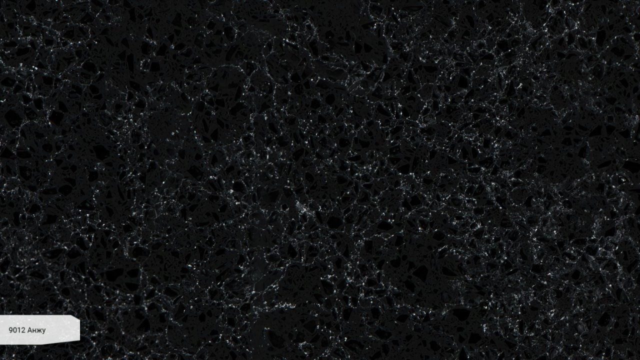 - Цвет искусственного камня Авант Кварц 9012 Анжу: цвет черный. С более черными крупными, средними и мелкими вкраплениями. Помимо них имеются крупные 3D вкрапления идеально-прозрачные, напоминающие кусочки стекла- хрусталя. Через которые можно увидеть всю глубину цвета, похожий на черный гранит с бело-серыми вкраплениями. Имитация гранита с бело-серыми вкраплениями также наблюдается на поверхности в виде прожилок.
