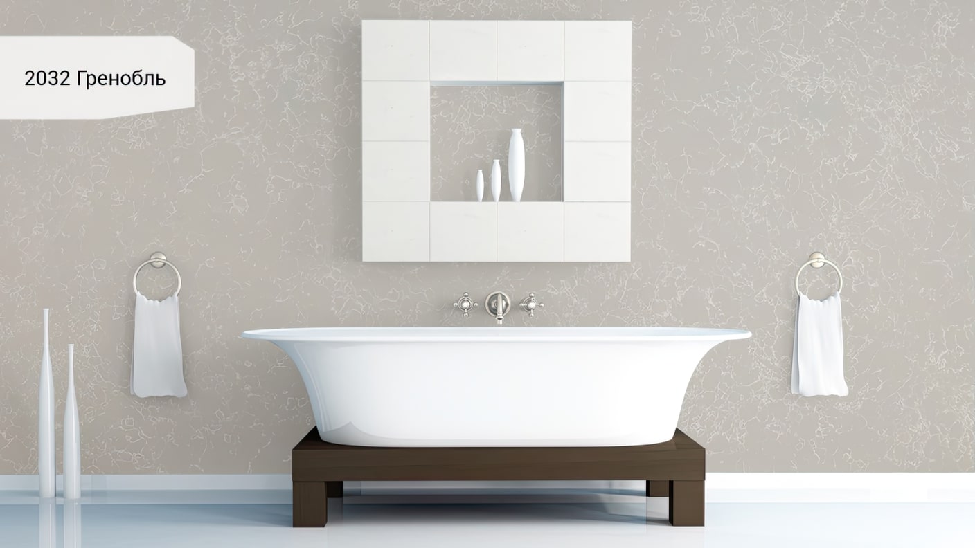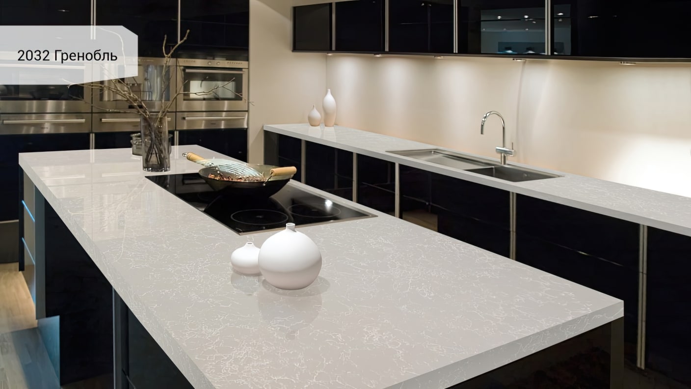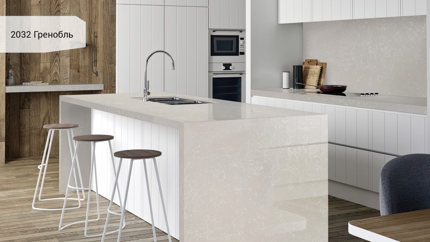 Кварцевый камень Гренобль 2032 широко используется для облицовки и изготовления кухонных столешниц, барных стоек, подоконников, ступеней, полов и стен.